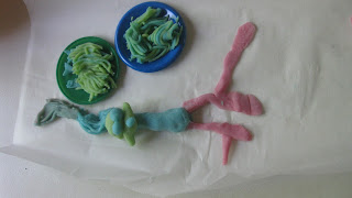 Her sidder mine børn så og laver figurer og kager ud af modellervoksen.